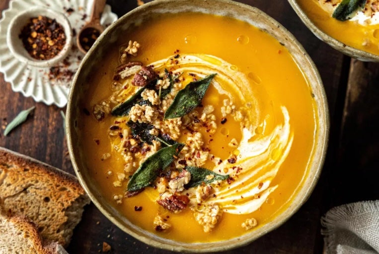 Emilie Franzo reveals the recipe for her cream of pumpkin and carrot soup with sage chips, from her book Soupes Maison (Marabout).