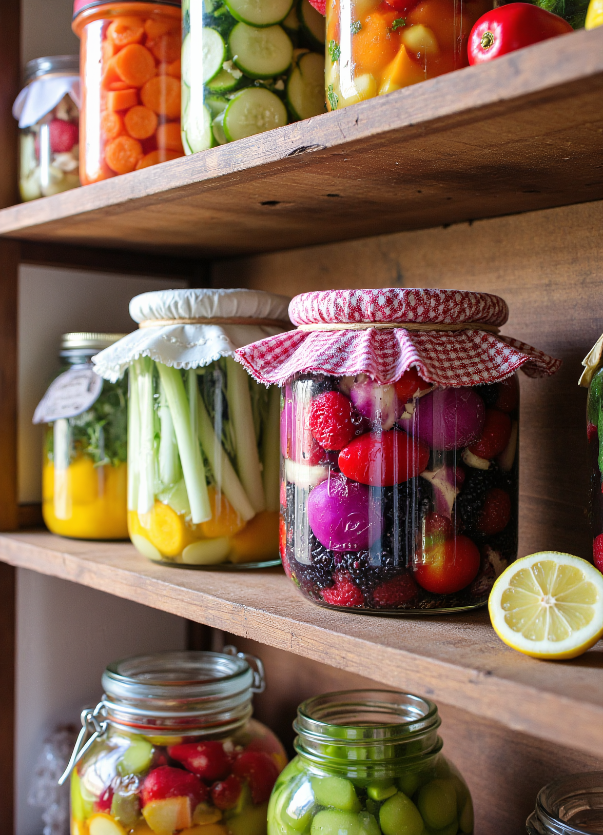 Whether it’s cabbage, cucumbers, carrots, or radishes, he recommends starting with seasonal fruits or vegetables that have a firm texture and good crunch. These hold up well during fermentation and yield a satisfying bite.