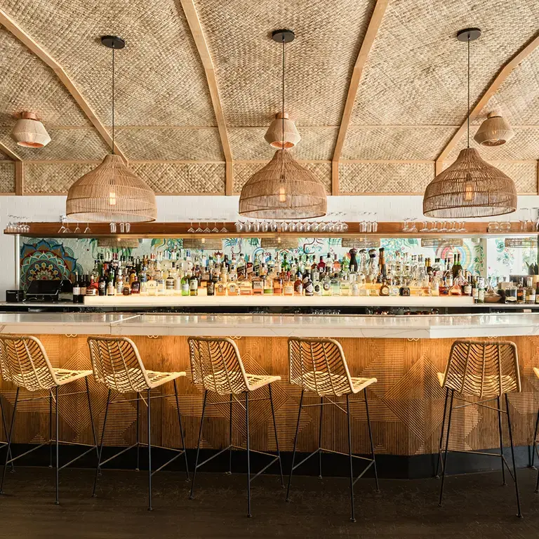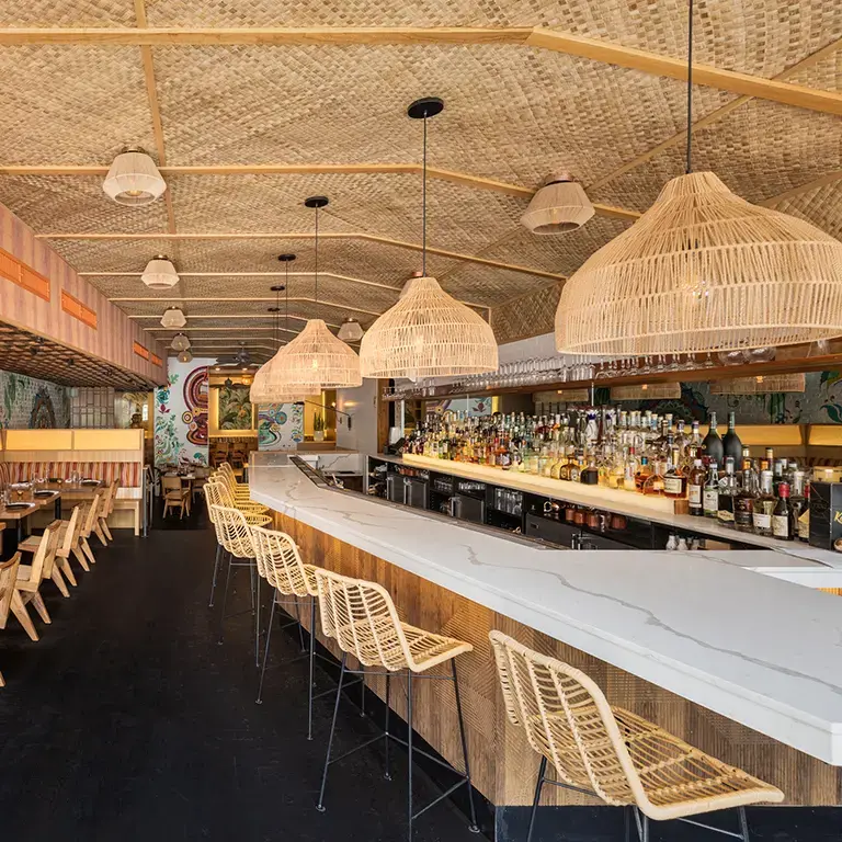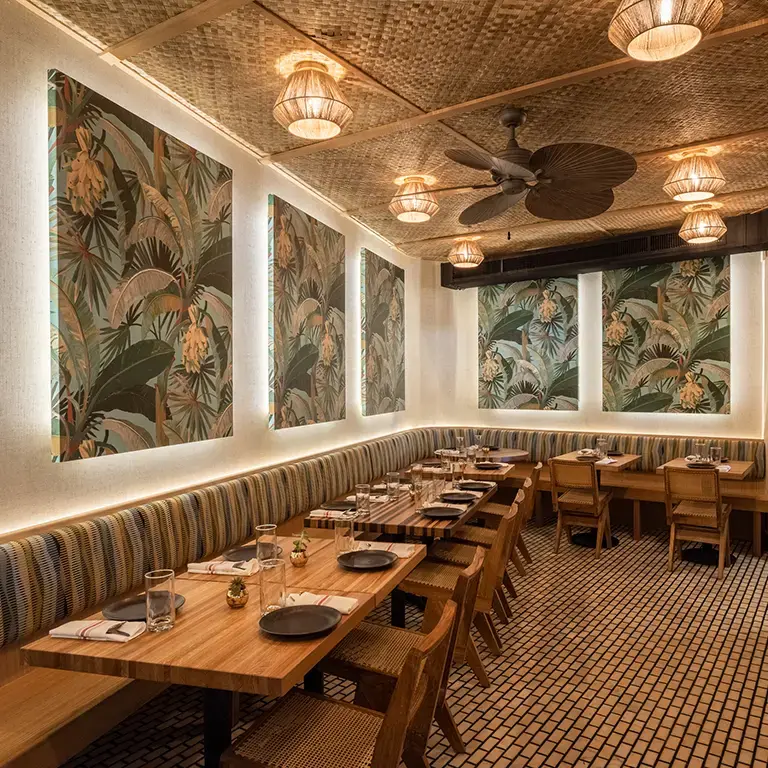 The colorful design and vibrant atmosphere of the space itself helps prepare guests for the explosion of flavor that awaits them. The long dining room is decorated with paintings of banana palm trees that bathe the place in greenery, the woven mats that cover the ceiling recall houseboats in Kerala, and the chairs are of a design that is iconic in Southern India. The desired effect of all this is to represent India in all its brilliant vitality, transporting diners there before they have even tasted their first mouthful.