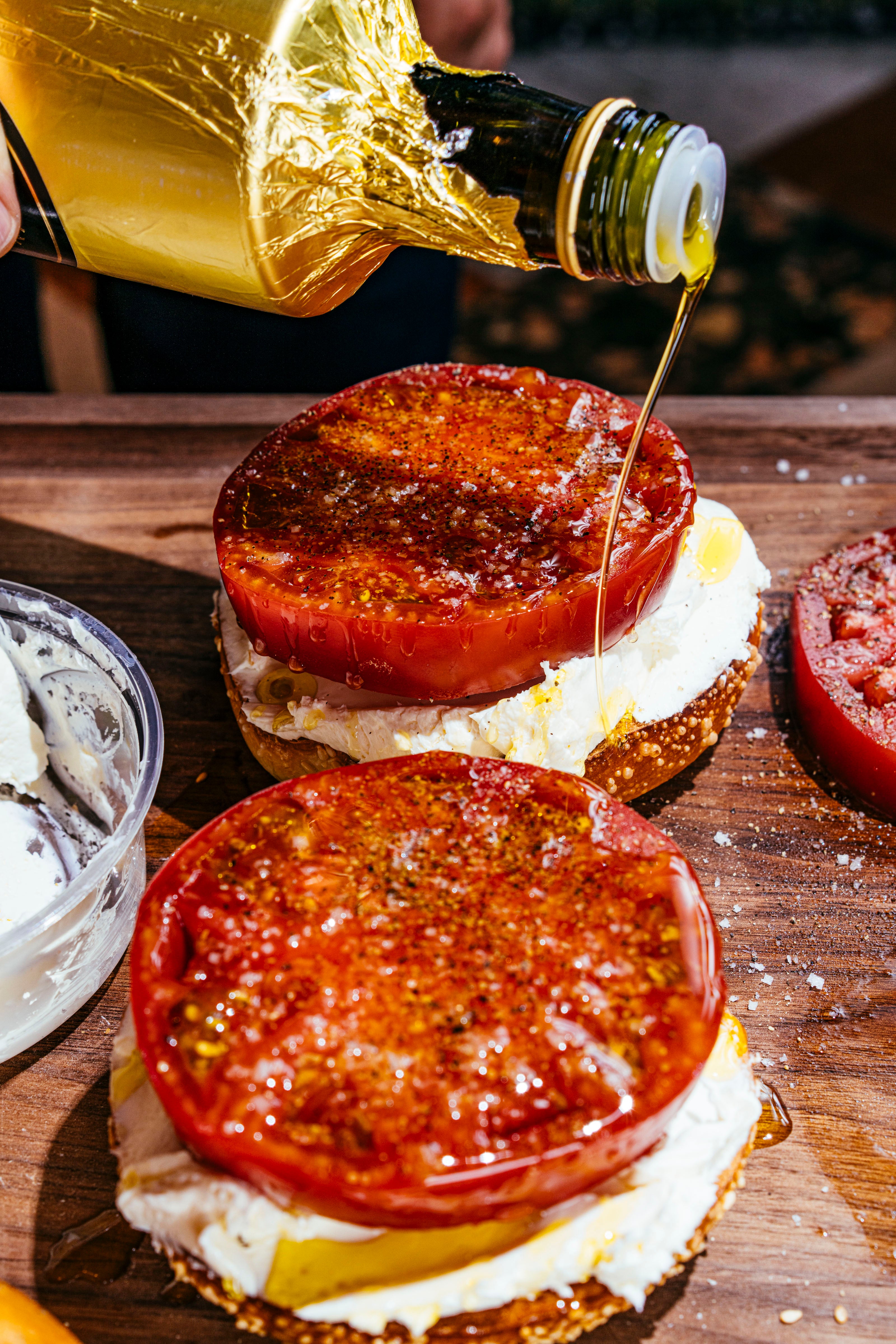 - Drizzle some olive oil all over the bagel, so it is dripping off of it.