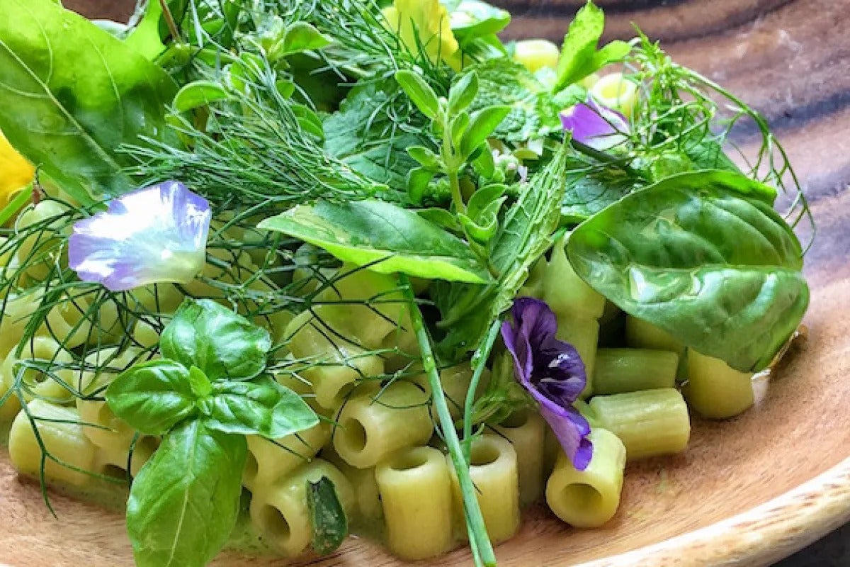 A 100% vegan dish of tubetti pasta with peas, broad beans and fresh herbs, perfect for spring and summer, by chef Cesare Battisti from Ratanà in Milan.